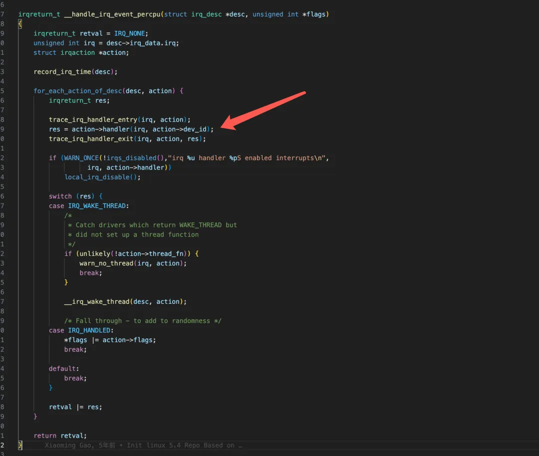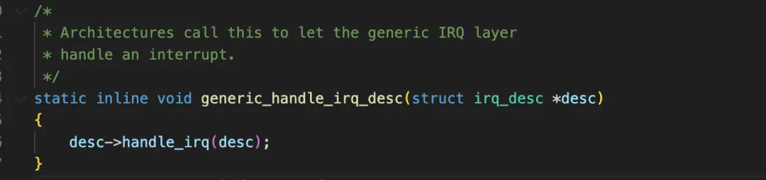 执行generic_handle_irq_desc,这个函数会沿着中断描述符的链式结构,最终调用到设备驱动注册的中断处理函数