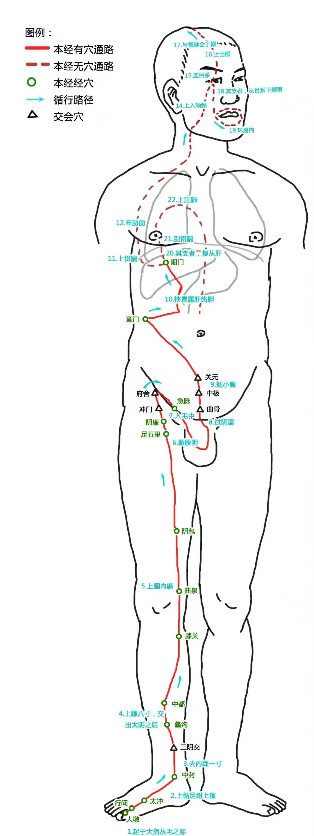 足厥阴肝经一侧有14个穴位,左右合计28个,以上歌诀读几遍就能朗朗上口,方便日常对照记忆: