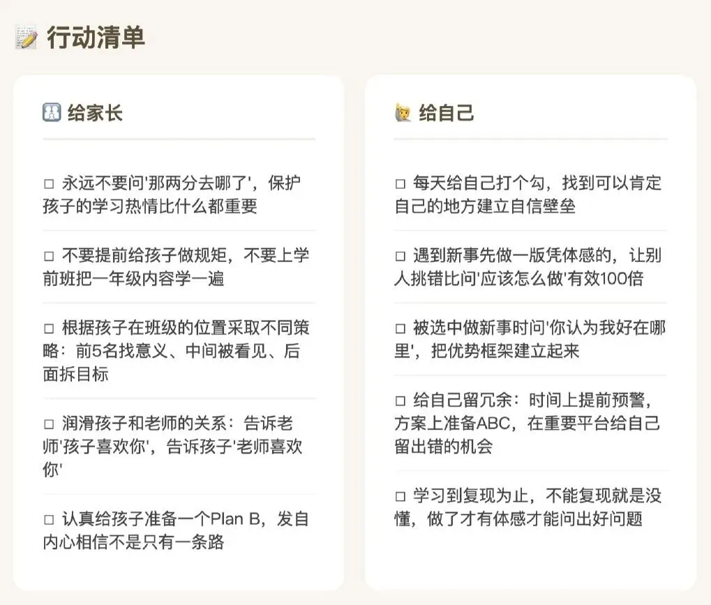 清晨的长谈,如同一场高浓度的思想淋浴。泉灵老师与脱不花从“学习的动力三角”聊到“复现是学习的金标准”,金句频出。但最击中我、让我立刻按下截图键的,是一张清晰的“行动清单”。这张清单,精准地分成了“给家长”和“给自己”两部分。它不像道理,而像一本清晰的工具手册。这份清单,给予我的不是焦虑,而是一种清晰的“元认知”:知道了在家长这个角色上,什么该做,什么不该做,以及如何先安顿好自己。在2月的最后一个清晨,它为我的3月家长角色,做了一次清爽的认知重启。
