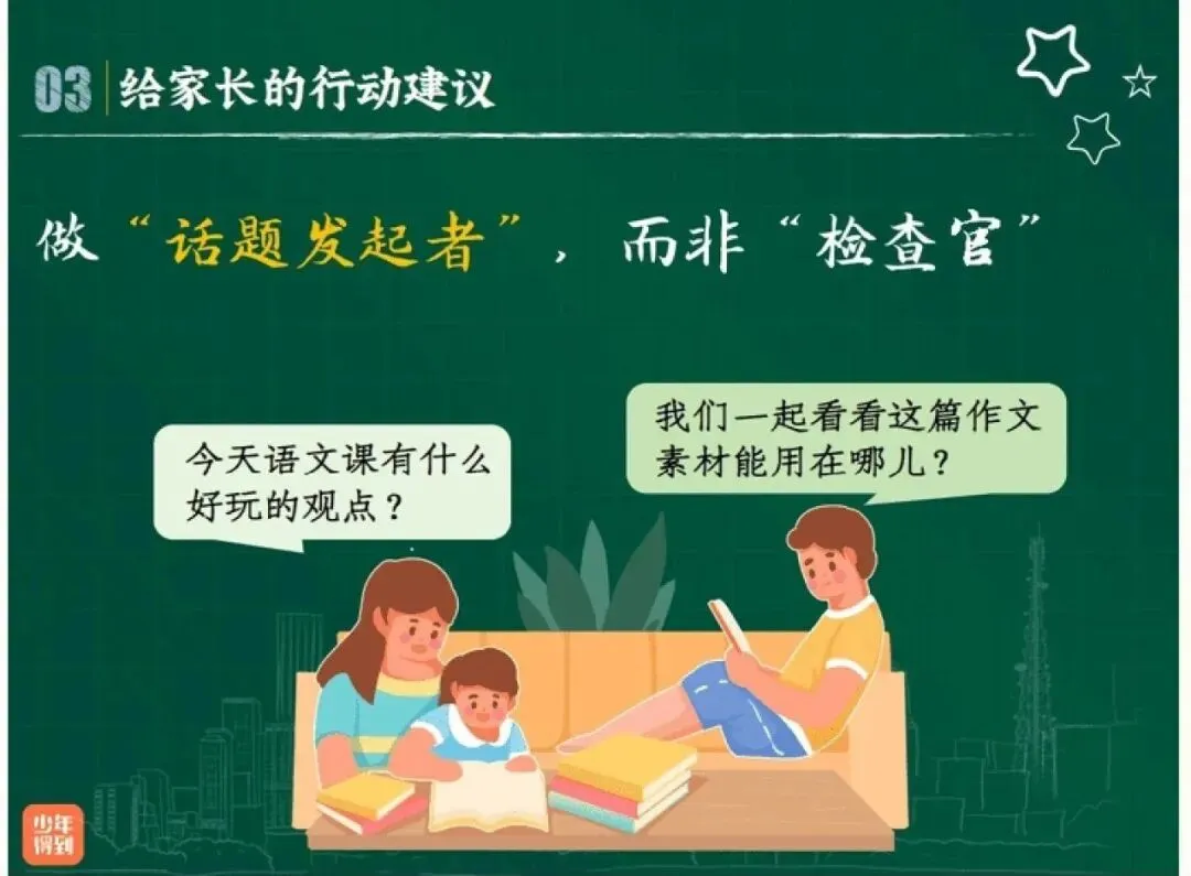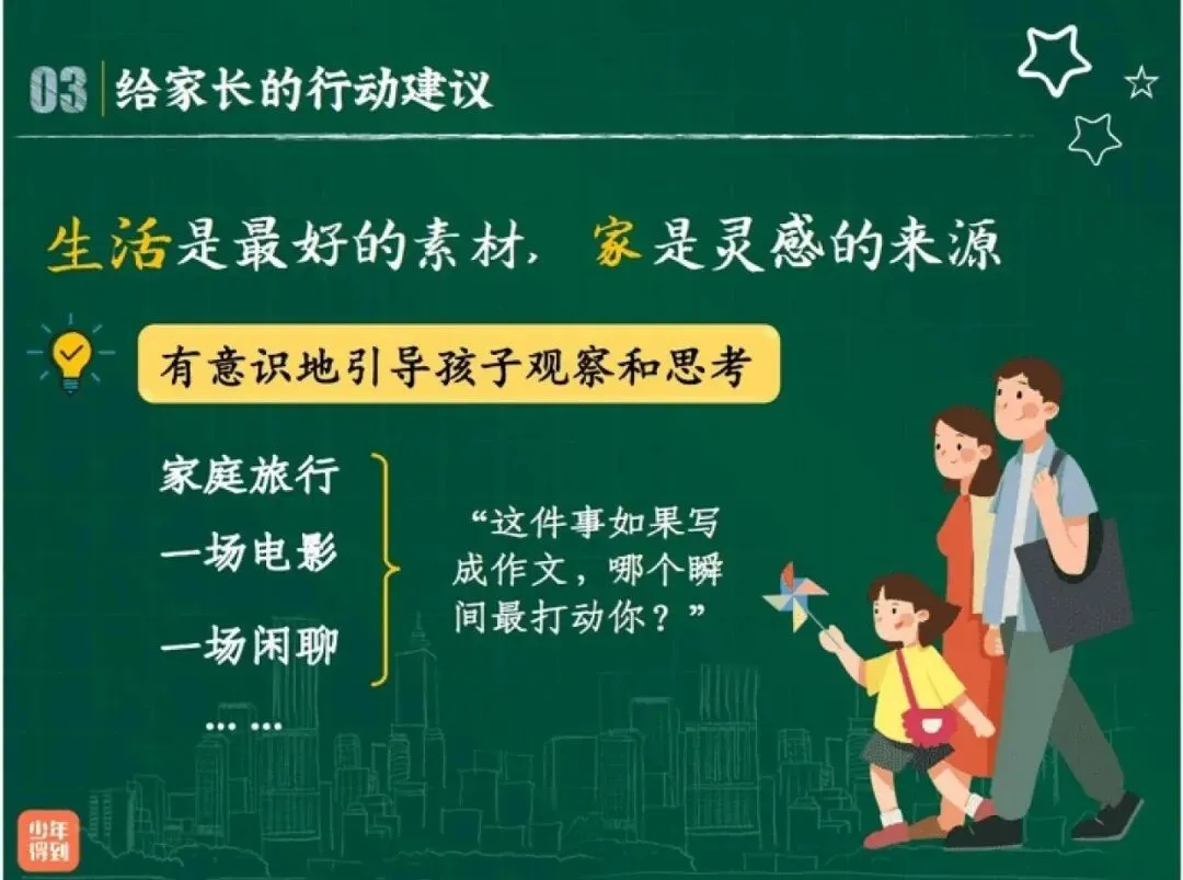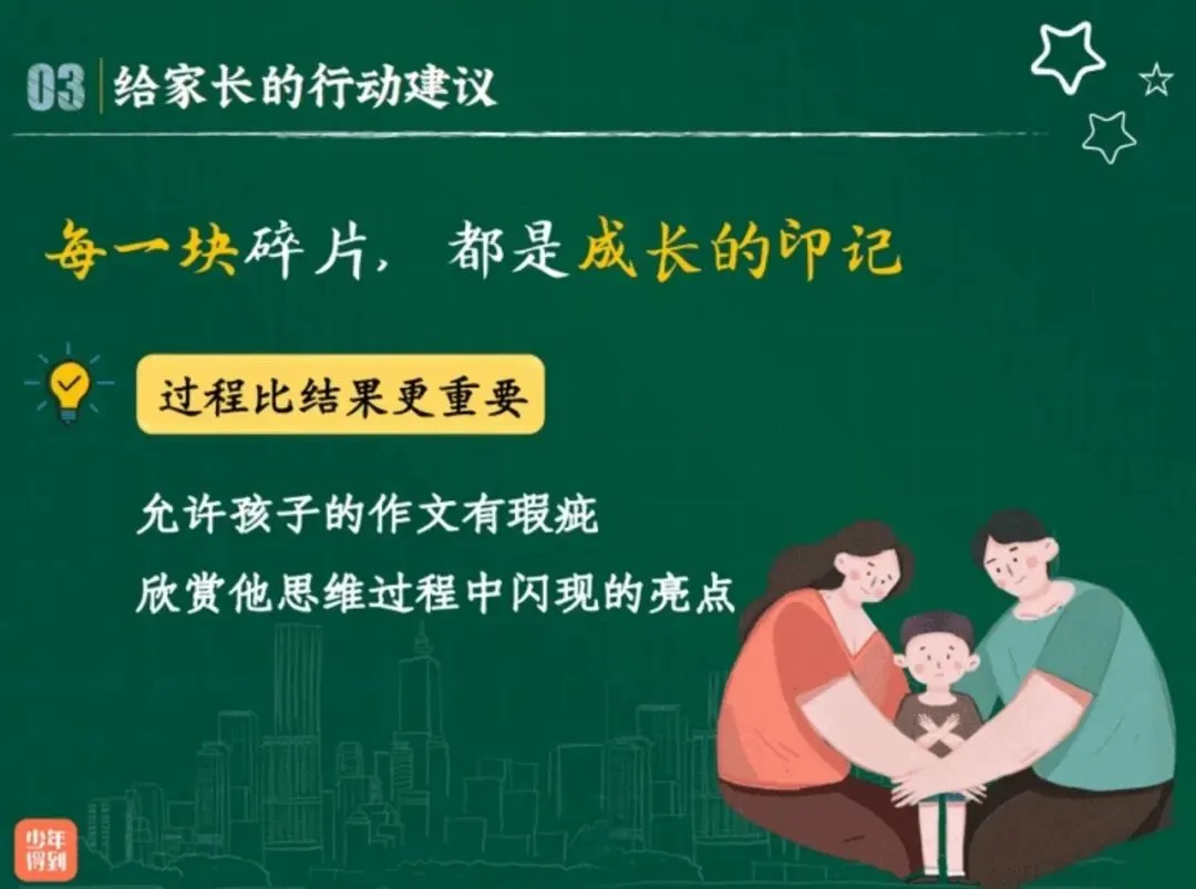 如果说《长谈》提供了底层心法,晚上的班会课则给出了三把趁手的工具。从“作业写完了吗?”换成“今天语文课有什么好玩的观点?” 从审视结果,转向开启一场关于思考的对话。角色的转变,带来的是沟通氛围的根本变革。“这件事如果写成作文,哪个瞬间最打动你?”——将这句话植入一次家庭旅行、一场电影甚至一场闲聊后,我们就把生活,变成了最好的作文素材库和思维训练场。3.“过程比结果更重要。允许孩子的作文有瑕疵,欣赏他思维过程中闪现的亮点。”这句话,是对“不问那两分去哪了”的完美呼应和具体化。它让我们把目光从完美的成品上移开,去珍视那些稚嫩但真诚的思考闪光。每一块碎片,都是成长的印记。🌱 最好的学习: