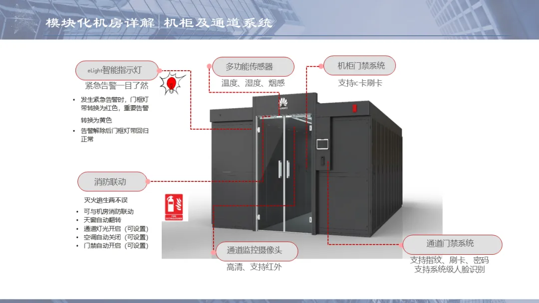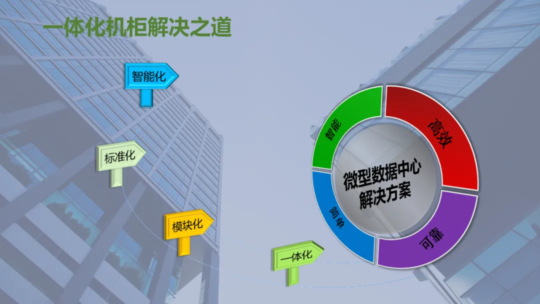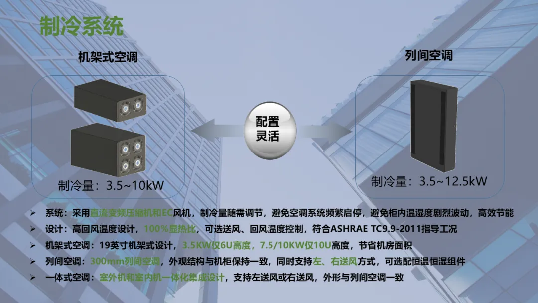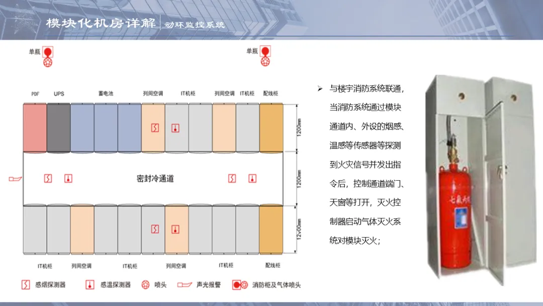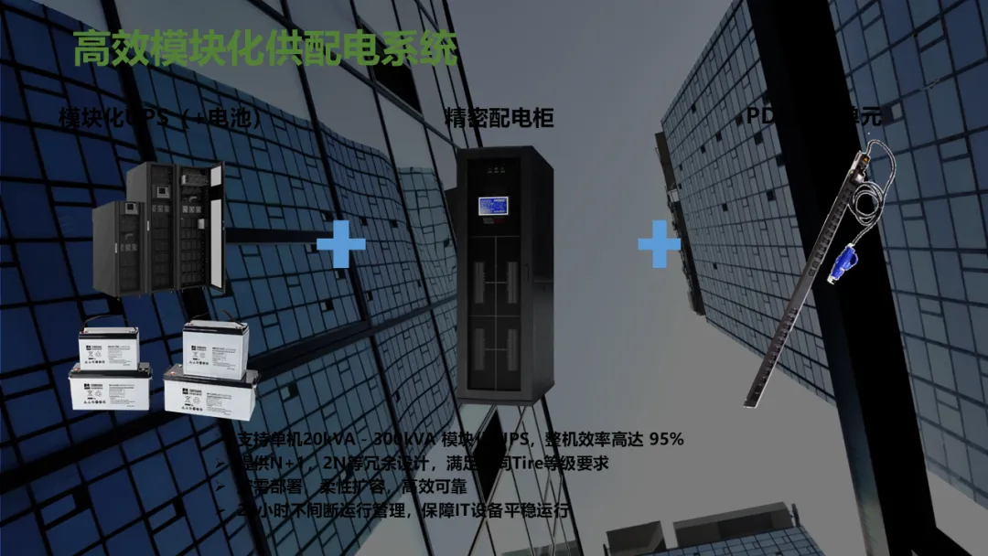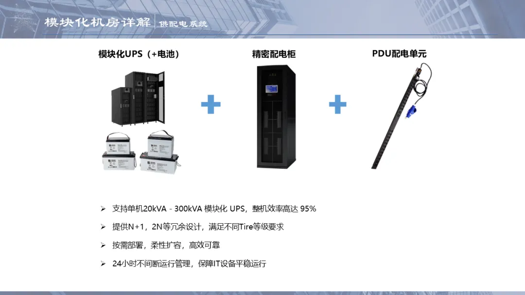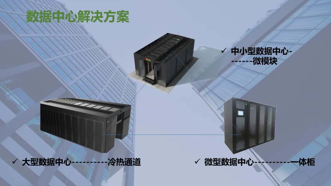 Ø模块化机房是指整个机房分为若干个独立区域,一个模块就是一个单体独立的小型数据中心,模块化机房融合了制冷、供配电、通道及机柜、布线和动环监控等所有子系统,随着业务需求的不断扩容,增加独立模块,可以灵活组合满足不同客户对于可靠性等级、功率密度、安全等级不同的要求,从而实现快速建设的目的
