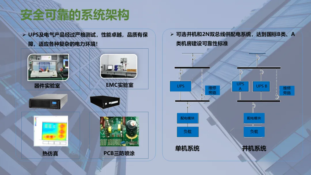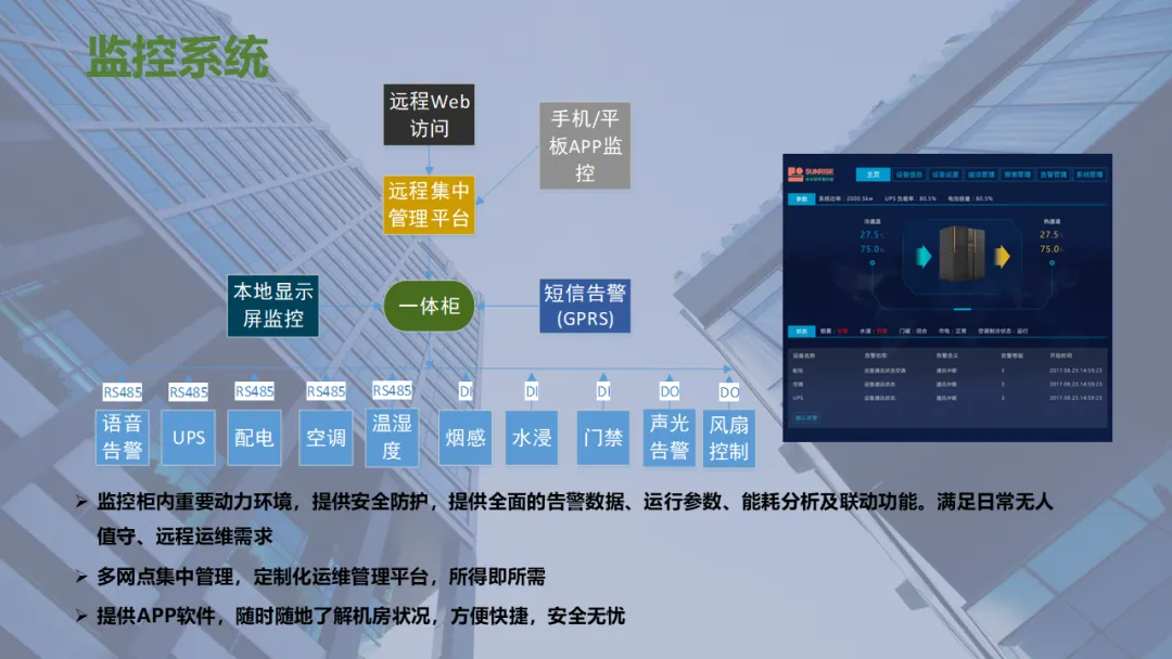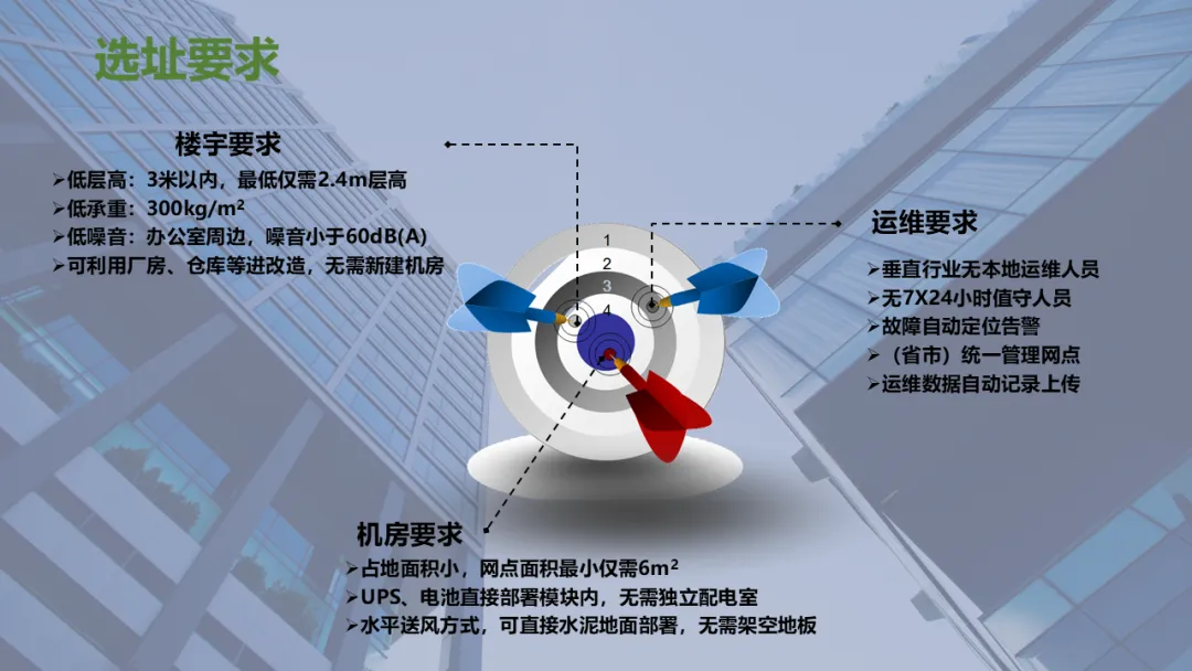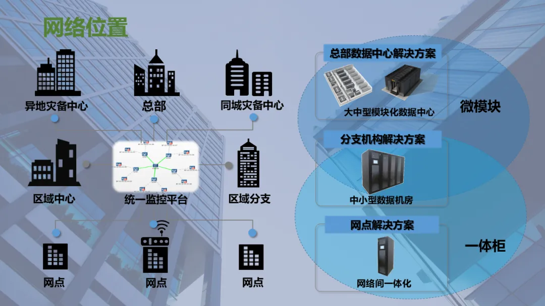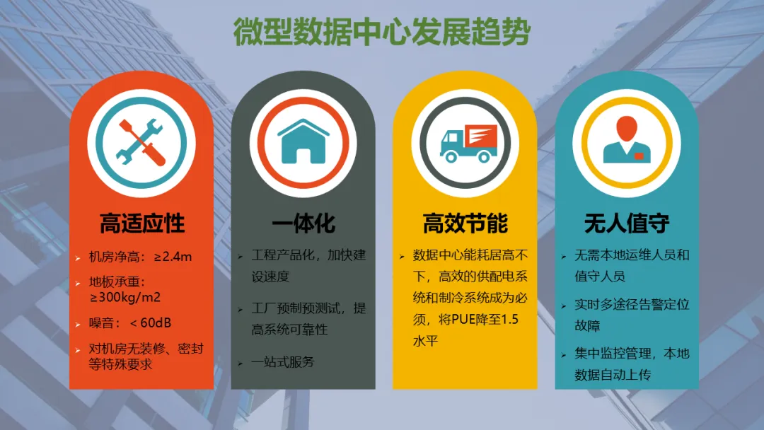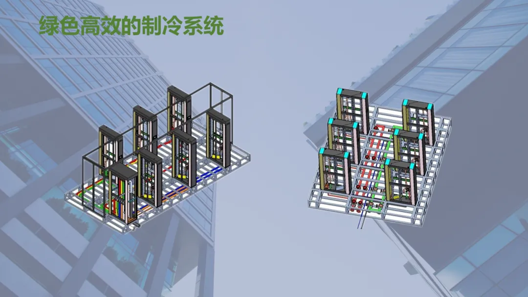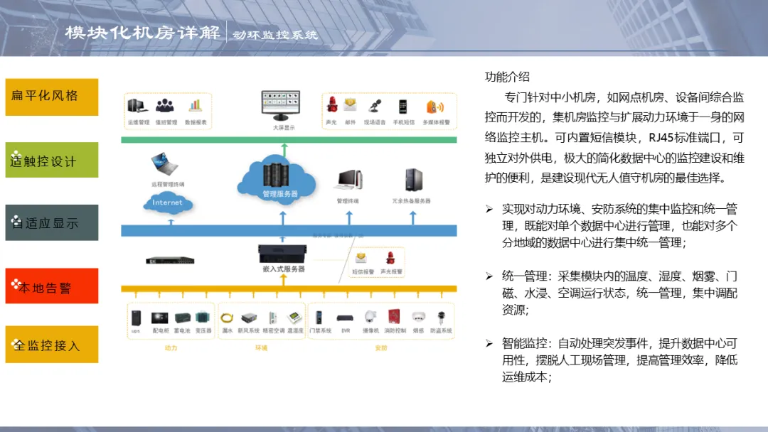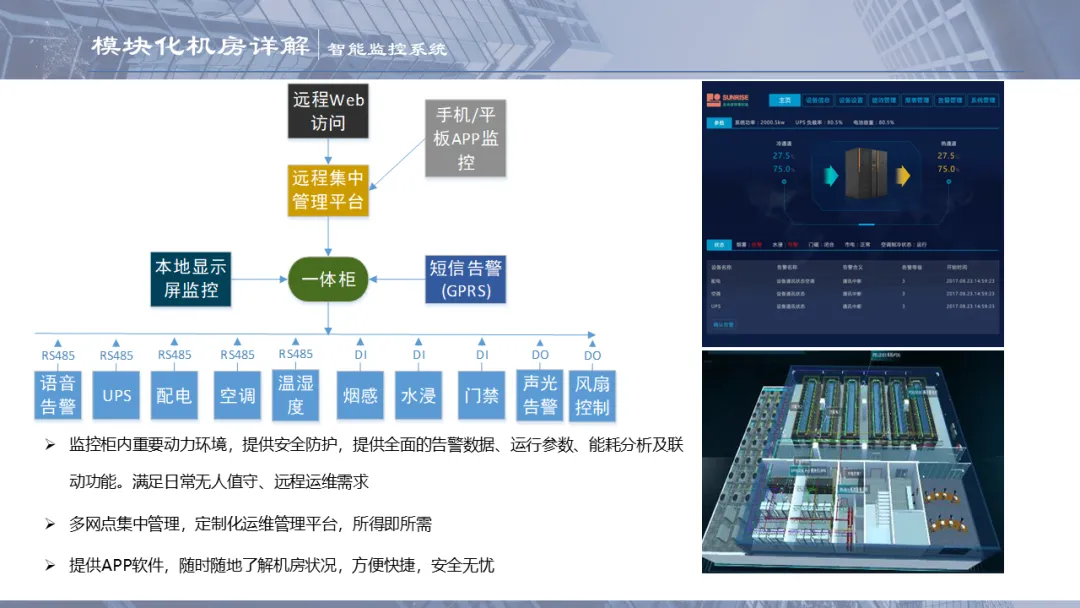 Ø模块化机房是指整个机房分为若干个独立区域,一个模块就是一个单体独立的小型数据中心,模块化机房融合了制冷、供配电、通道及机柜、布线和动环监控等所有子系统,随着业务需求的不断扩容,增加独立模块,可以灵活组合满足不同客户对于可靠性等级、功率密度、安全等级不同的要求,从而实现快速建设的目的