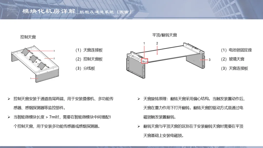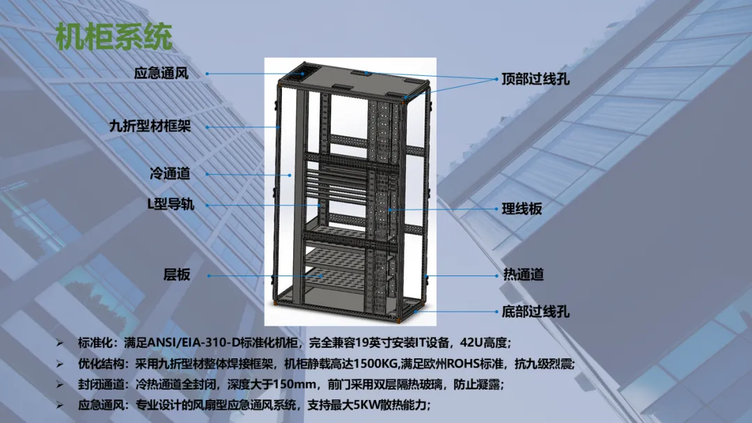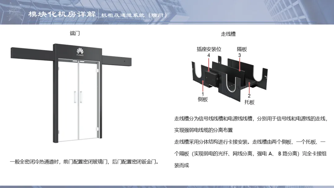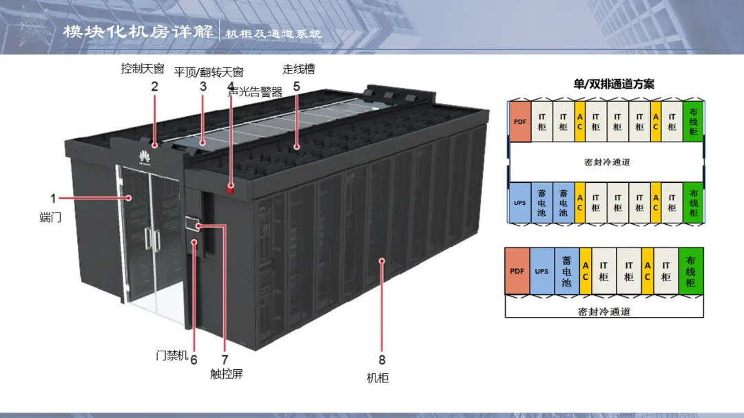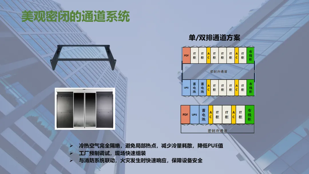 密闭通道一般会分为密闭冷通道和密闭热通道两种,通道包括IT机柜、网络柜、配电柜(精密配电柜、一体化UPS或一体化配电柜统称为配电柜)、行级空调、电池柜、天窗、端门、走线槽等。