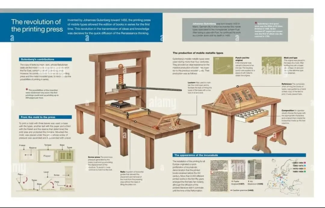 15世纪中叶,印刷术进一步革新,第一部用活铅字排印的拉丁文《四十二行圣经》在德意志人谷腾堡的工厂问世。到1500年,已有三四万种图书被印制出来,总数约有1000万册之多,书籍变得越来越便宜。