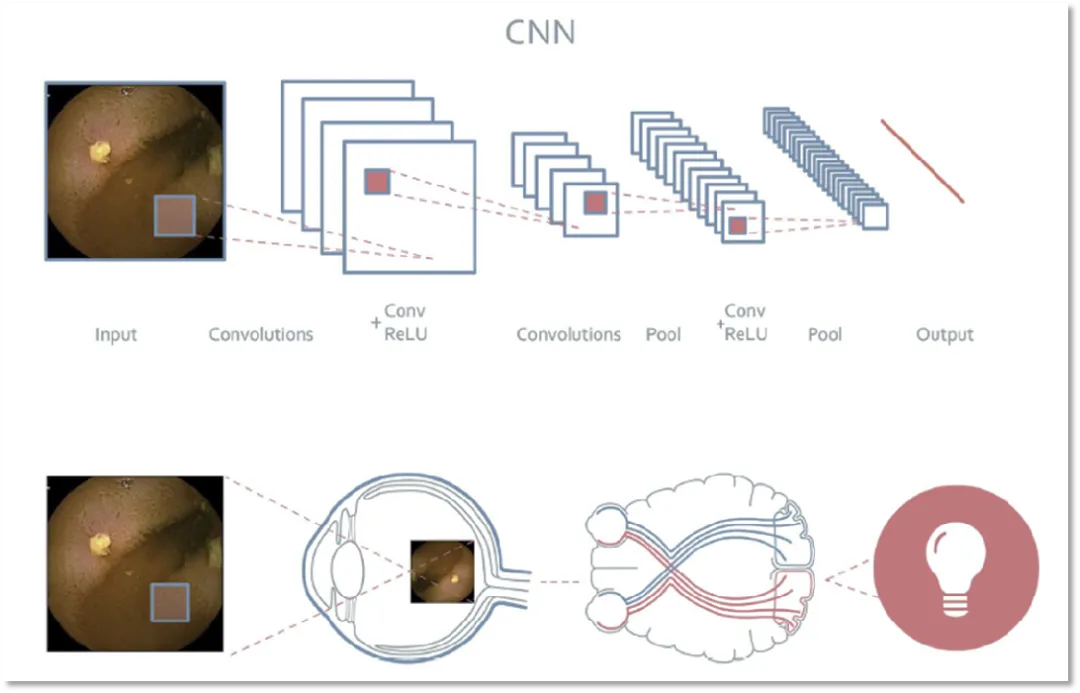 6.3.卷积神经网络(CNN):神经网络这一概念最早是生物界提出的,而人工智能界的神经网络某种程度上来说,是在模拟人类的神经元。我们视觉神经不是简单的告诉大脑光线被检测到,而是光线和黑暗之间的对比,也就是形状被感受到了。有神经元传输到感受域来做出判断,同样CNN的输入的也是图像,图像是像素的矩阵,每个像素在图像中是一个单独的数字,通过层层传导以产生最终的预测。CNN在肠道研究中特别重要,因为它们的设计非常适合图像分析(二维信息)。