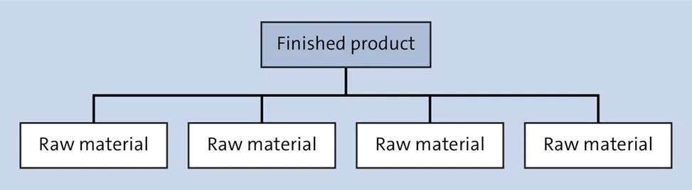 例如,如果选择使用单一 BOM,其中原材料是成品 BOM 的直接组成部分,下图所示,那么产品结构中将不会有半成品。因此,将无法为半成品物料计划或构建任何库存缓冲区。另一方面,设计扁平化 BOM 会创建一个非常精简的产品结构,简单的主数据维护将减少为制造单个产品而创建的库存过账和订单的数量。