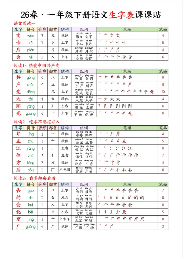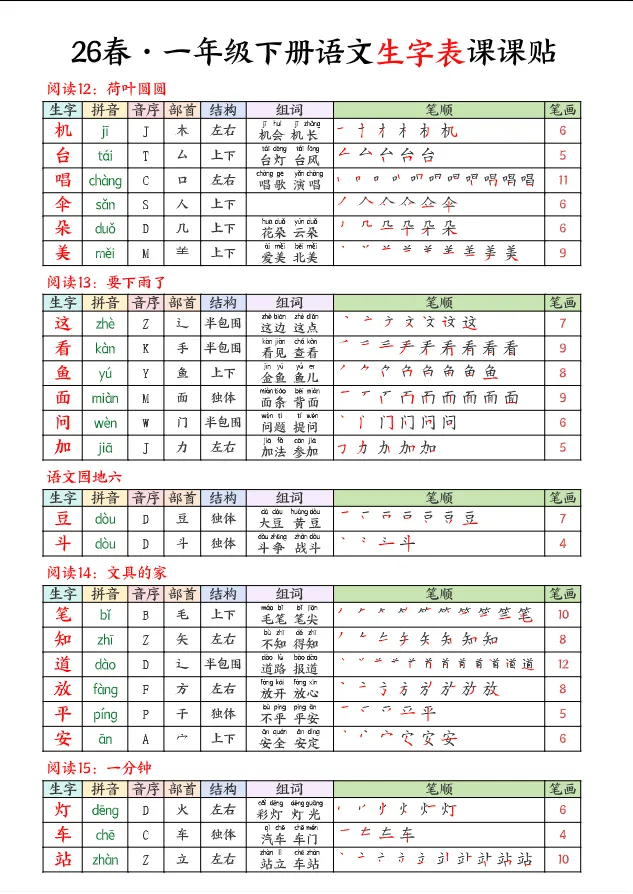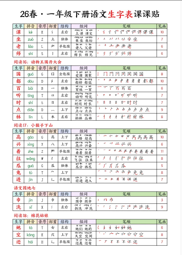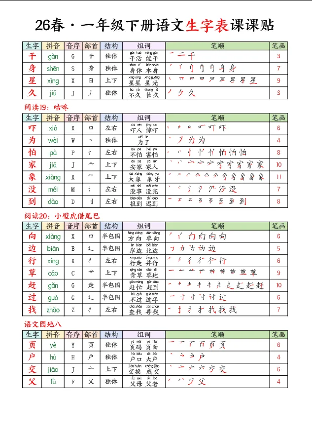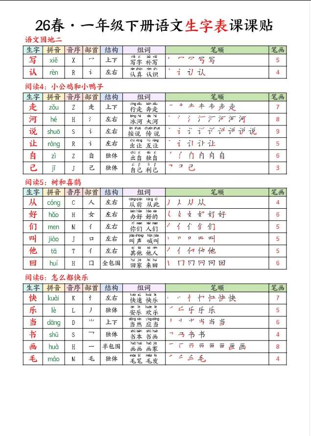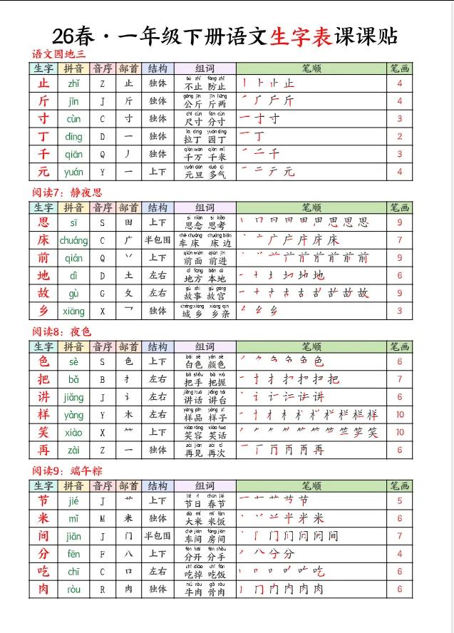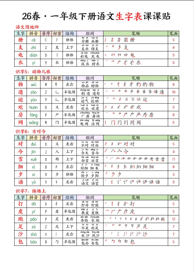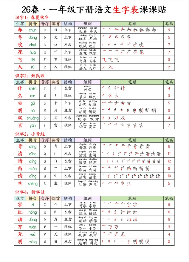 >学习资料库 3-1【「26春 语文下册 1年级 生字【课课贴】 高清可打印】