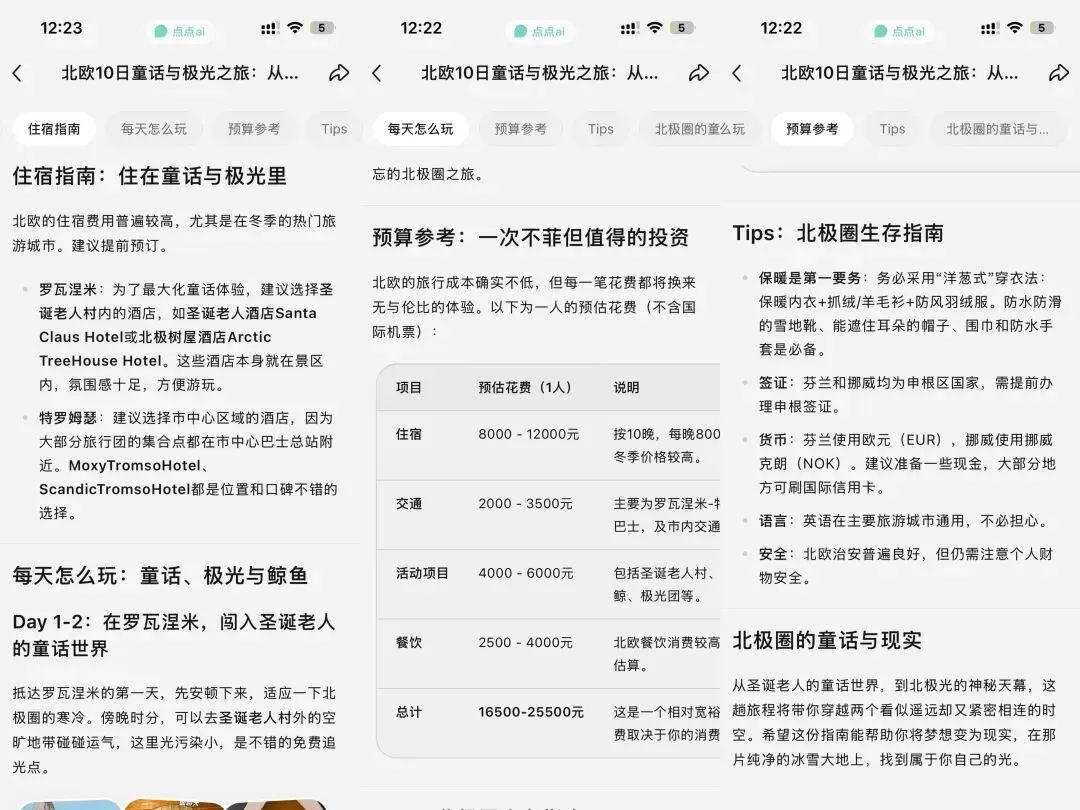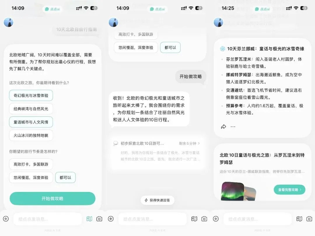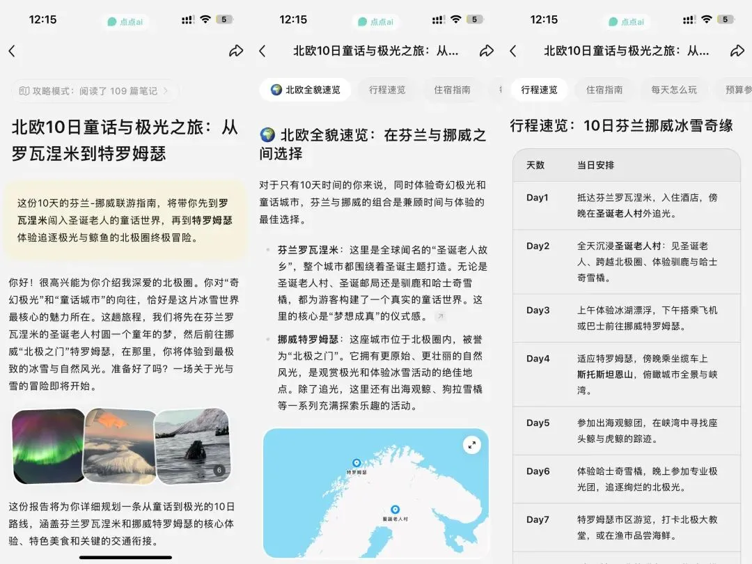 「点点」是小红书官方推出的AI生活助手,在小红书平台有非常醒目的入口,而且也已上线独立APP,春节期间平台给予了很多流量推荐这个产品。点点的Slogan为“你的生活助手”,也就是帮助你解决生活中遇到的问题,比如某道菜谱,猫粮推荐等等。如果你有选择恐惧症,希望从海量的笔记中快速获取问题答案,那么可以尝试使用点点。点点支持文字/语音/图片输入需求,模型根据学习到的小红书笔记内容为你整理出答案,官方介绍的能力包括整理总结、种草推荐、行程规划。如果希望获得非常细致周全的指南,可以开启“攻略模式”。对攻略模式比较好奇,让它帮我生成了旅行攻略、新手相机攻略、新手养猫攻略。攻略的生成过程不像即时对话,用户输入关键词后,大概需要等五分钟左右看到结果,攻略的形式也并非是对话框文字,而是一篇文章,而且每人每天只有三次生成机会。以旅行攻略为例,下面着重介绍我输入了10天北欧自由行指南,它识别出我的信息不完整,北欧范围很大,而且缺少兴趣偏好,因此从知识库调取了标准选项让我选择。接着开始生成攻略,整个过程需要五分钟左右。核心攻略部分真人感十足,既包括专业的规划建议,也有真实的感受输出。结构化表达是所有AI基本都能做到,点点攻略也不例外,先总结再具体讲解,符合用户从宏观认知到微观执行的心理路径。全貌速览:介绍此次行程的推荐理由,以及插入了标记目的地的地图,让你了解行程的全貌TIPS:介绍穿衣、签证、货币、语言、安全相关的小tips攻略内容层次分明,图文并茂,阅读体验非常友好,没有传统网页的压迫感。每个模块内容按照总-分结构呈现,排版工整,重点突出引入小红书笔记图片,点击图片可以一键回到原文查看更细节的内容——因为引用了大量笔记内容,所以内容真实且实时,细节丰富,价格、操作方式、注意事项都为你考虑到了