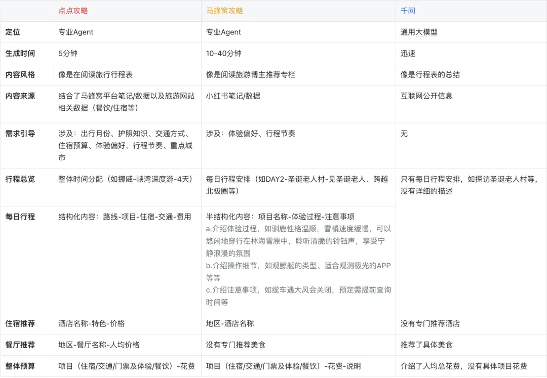 为了展示出差异,我对比了直接在千问和马蜂窝给出的攻略,可以看出点点攻略既有内容的专业性,又兼顾人文关怀,有这样一个小助手,能省去很多用于查资料的时间和精力。开篇介绍-全貌速览-行程速览