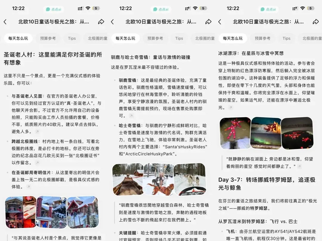她知道具体的价格,比如与圣诞老人合影后打印的纸质照片需要40欧、“北极圈证书”她知道游玩项目的具体方式和注意事项,比如观景之旅有哪些船型、极光之旅需要用到哪些app,并建议你提前官方购票她也明确指出了哪些是“雷区”(如某些购物陷阱、体验感差的项目)——她也像你的互联网友邻,有喜怒哀乐,向你表达她的感受,安利你前往提到圣诞老人村,她说“这里不只是一个景点,更是一个充满仪式感的体验乐园。”提到驯鹿与哈士奇雪橇,她说“这是在罗瓦涅米最不容错过的体验”“驯鹿雪橇充满了童话色彩,哈士奇雪橇则是速度与激情的代名词”提到特罗姆瑟的夜景,她说“尤其是在蓝调时刻,城市灯火初上,天空呈现静谧的蓝色,景色非常梦幻”页面示例