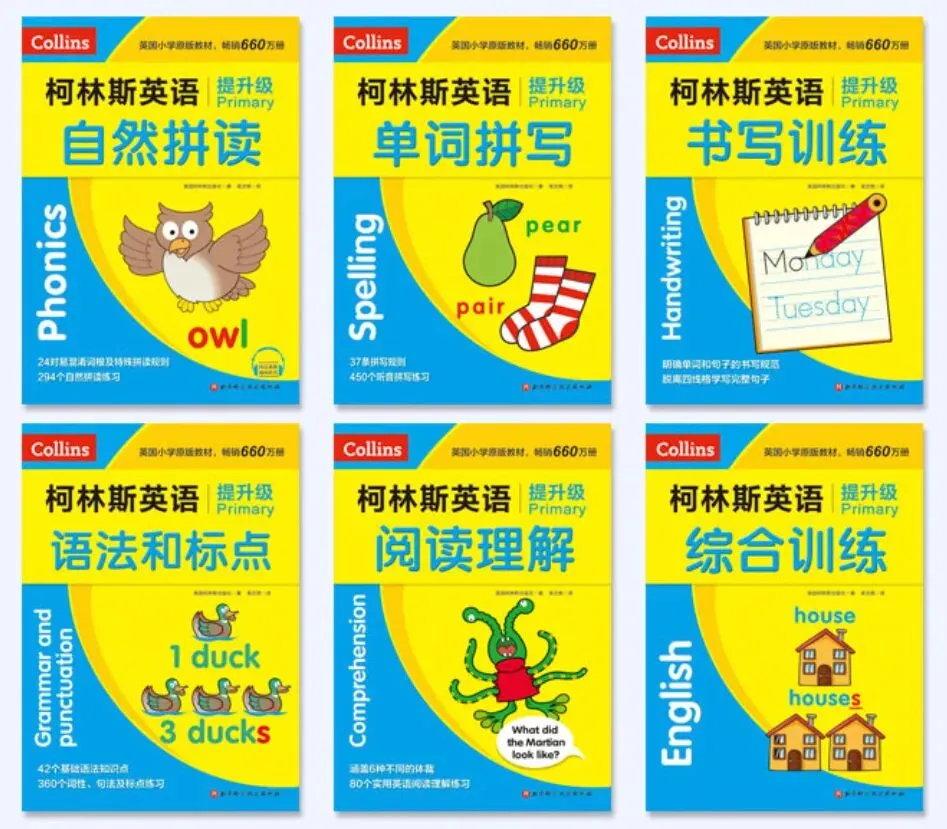 @daisy张:英语的话我们一直用《柯林斯英语自然拼读》习题册,主攻自然拼读,字母音、高频词、阅读、书写都会训练到。此外还给老大入了木头马阅读训练、阳光同学作文训练,但没有有效利用起来,教辅真的不能太多,按着一套做就够了。
