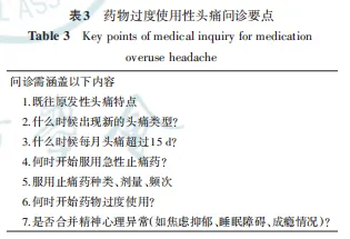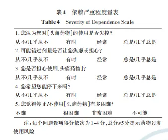 在诊断方面,共识不仅重申了ICHD-3的诊断标准,还特别强调了详细的病史询问(如表3)、鉴别诊断以及使用“药物依赖性严重程度量表”(SDS,如表4)等工具来识别高风险患者,体现了诊断策略的精细化。