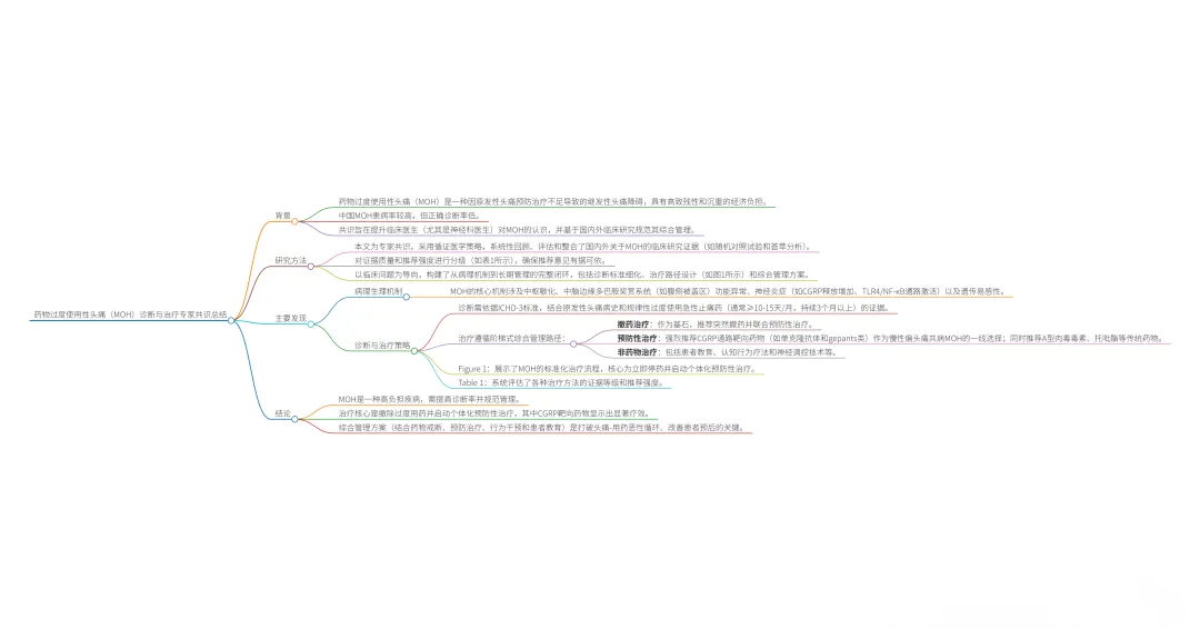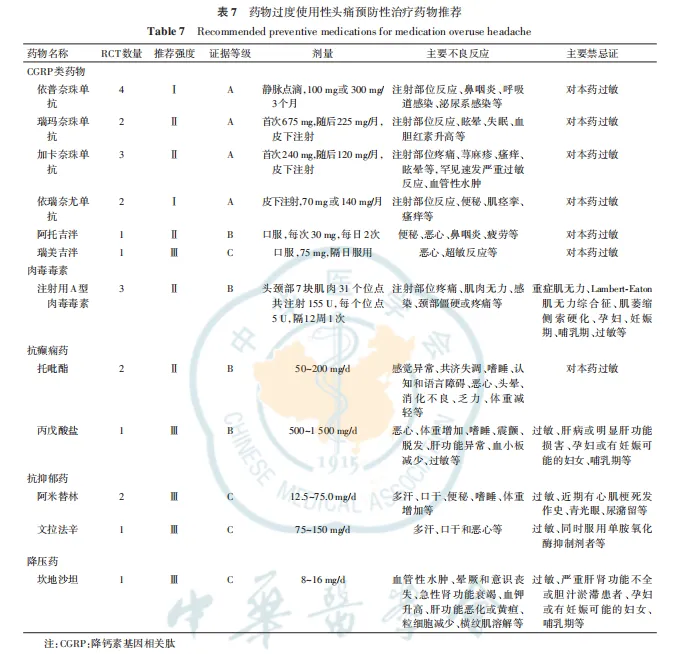 :系统评估并强烈推荐在撤药基础上启动预防性治疗,并详细列出了各类预防药物的疗效证据、推荐等级、用法及注意事项,尤其是对CGRP靶向药物(单抗和小分子拮抗剂)在合并MOH的慢性偏头痛患者中的显著疗效给予了高级别推荐。