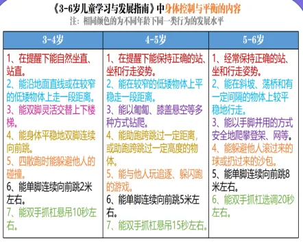 可参考《指南》,包括走、跑、跳、钻爬、攀登、垂悬等平衡能力,涵盖了上下支撑平衡,以及静态平衡、动态平衡、客体平衡。