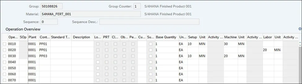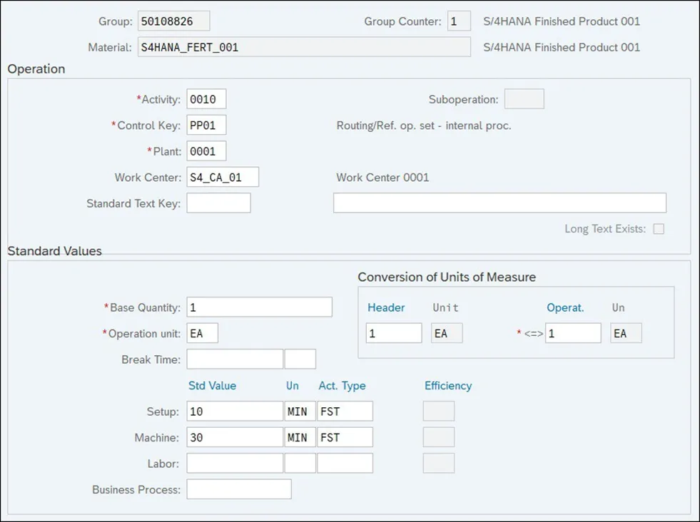 每个工艺路线操作都将在工作中心上执行,并且每个工作中心都有一个标准值健,其中包含在制造过程中可以执行的不同活动(例如,设置或机器加工)。创建工艺路线时,需要确定为每项活动计划的时间,该时间用于计算总工序持续时间。工期是根据工作中心中定义的公式计算的;SAP 提供标准公式来计算设置和处理持续时间,但也可以根据需要创建自定义公式。下图显示了带有标准值的工艺路线操作详细信息。