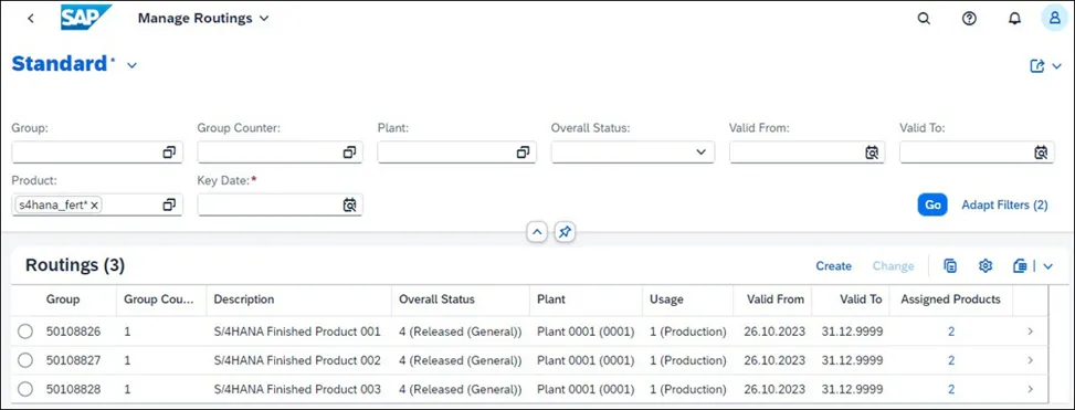 SAP S/4HANA 还提供 管理工艺路线 app,允许在 SAP Fiori 启动板中进行工艺路线维护。如下图所示,此app提供了一个专为 SAP Fiori 设计的新选择屏幕,但它将调用前面提到的事务来执行实际的路由维护。