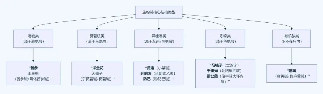 2.生源分类:按生源途径分为吡啶类、莨菪烷类、异喹啉类、吲哚类、有机胺类等。考试重点在于具体中药,而非分类本身。