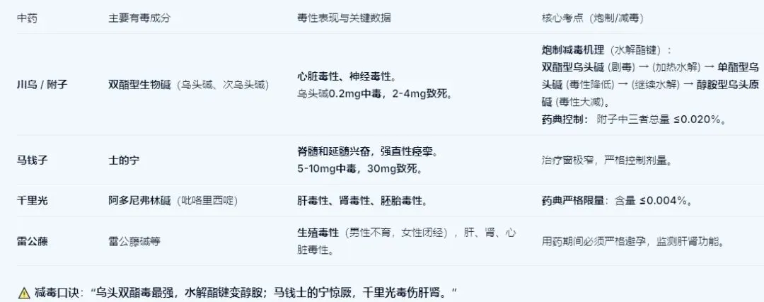1.“双毒”:川乌/附子(双酯型) 与 马钱子(士的宁) 均为剧毒,但毒性成分和机理不同。