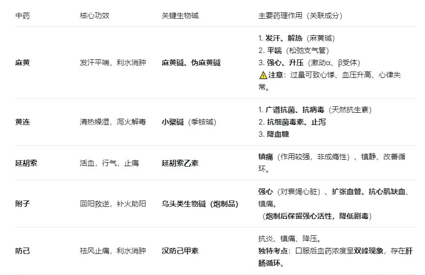 2.“双碱”:黄连(小檗碱-季铵碱) 与 麻黄(麻黄碱-有机胺) 均常用,但碱性强弱、溶解性、药理迥异。