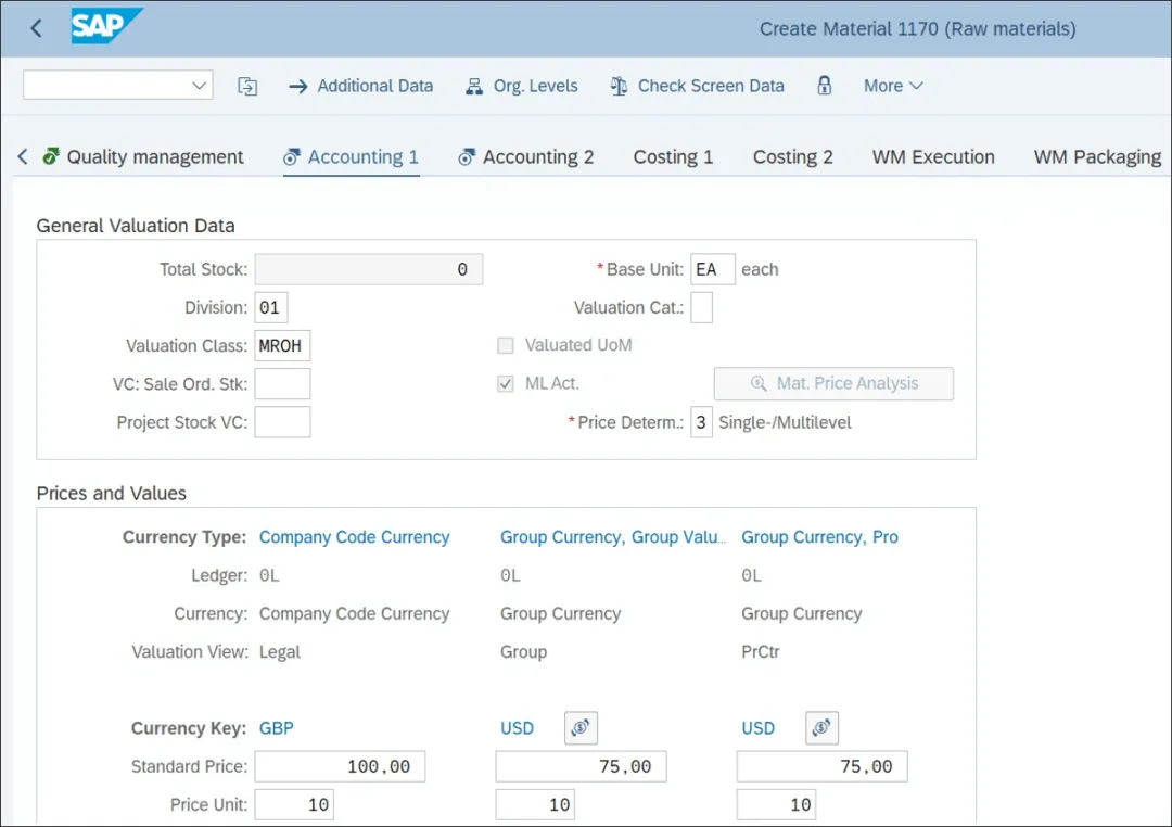 物料的会计视图是在评估范围层面维护的。如果评估控制设置在工厂层面,则会计视图在工厂层面创建。会计视图包含评估细节,如价格控制、物料单价、自动科目确定的属性、如果物料进行分割评估的分割会计细节等。物料主数据有两个会计视图。下图展示了物料主数据的会计1视图。基本计量单位是从物料主数据的基本数据1视图复制而来的。这是一个显示字段。系统以创建会计1视图的工厂中的基本计量单位显示物料的当前总库存。评估类别用于确定物料分割评估的评估类型。分割评估允许您在评估范围(工厂)内配置不同的评估类别和评估类型。如果您希望进行分割评估,请在此处为物料分配一个评估类别。评估类默认来自物料类型。评估类控制物料移动交易中物料评估时的总账科目确定。价格控制(未显示;您可以通过向下滚动访问此字段)定义了物料的评估方式。SAP S/4HANA提供了两种库存评估方法——标准价格和移动平均价格:标准价格(S):标准价格是为物料设定的静态价格,它不会随采购活动而变化。物料的标准价格是固定的,直到您在物料主数据中手动更改它。移动平均价格(V):移动平均价格是随收货和收票等采购活动而变化的动态价格。系统根据收货和收票过账时的采购价格计算物料的移动平均价格。上图显示为物料分配了价格控制S(标准价格),并且物料的标准价格在会计1视图中维护。你若喜欢,点个❤️谢先👇