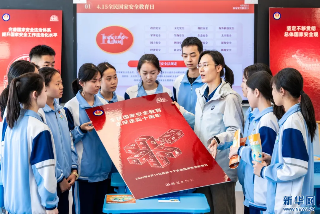 2025年4月14日,呼和浩特市玉泉区委网信办工作人员在呼和浩特市第二十七中学向学生宣讲普及国家安全知识。新华网 丁根厚 摄