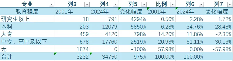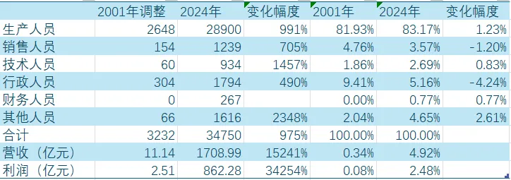 解读:我查询了2024年报,目前已经没有职称的描述,说明企业更加专业化了,以岗定职。有一些岗位没有再出现,例如供应管理人员、仓储人员,应该是归到生产人员中了,相应调整后,我们看到生产人员从2648人增加到28900人,增加了991%,不过对比营收提升的15241%和利润的34254%,增幅还是可控的,而且增幅较大的是生产、技术人员,说明公司是把质量放在第一位的。这一点从变化幅度上也可以看出来(图2)。