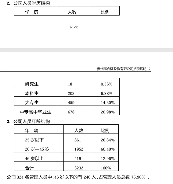 原文:学历结构与年龄结构构成(图3),其中研究生18名,占比为0.56%,本科生为203名,占比为6.28%,大专生为459名,占比为14.2%,中专高中毕业生为678名,占比为20.98%;25岁以下人数为861人,占比为26.64%,26~45岁人数为1952人,占比为60.4%,46岁以上为12.96%;公司324名管理人员中,46岁以下的有246人,占管理人员总数的75.9%。