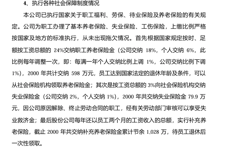 原文:本公司已经执行国家关于职工福利、劳保、待业保险及养老保险的有关规定(图6)。公司为职工办理了基本养老保险、失业保险、工伤保险,上缴比例严格按照国家及地方的标准执行,从未出现拖欠情况。首先根据国家规定按时、足额按工资总额的24%缴纳职工养老保险金(公司缴纳18%,个人缴纳6%,此比例每年调整一次,即:每满一年个人上缴比例上调1%,公司交纳比例下调1%),2000年共计缴纳598万元,员工达到国家法定的退休年龄及条件,可以从社会保险机构领取养老金;其次是按工资总额的3%向社会保险机构交纳失业保险金(公司交纳2%,个人交纳1%),2000年共交纳失业保险金79.9万元,因公司原因解除、终止劳动合同的职工,经有关劳动部门审核失业救济金;最后股份公司每年还以员工两个月的工资收入的总额,实行补充养老保险,截至2000年共交纳补充养老保险金累计结余1028万,待员工退休后一次性领取;