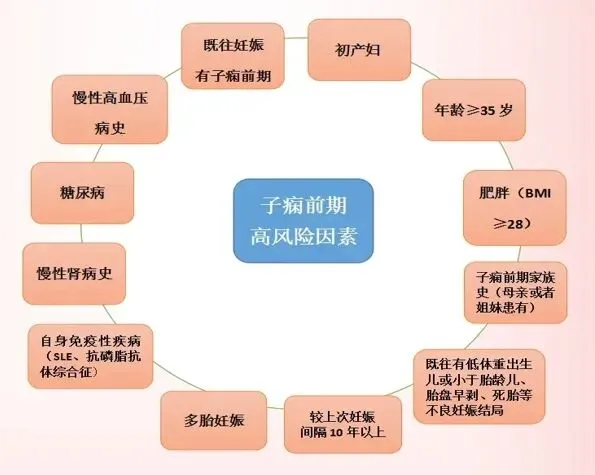 - 高风险因素:子痫前期史、慢性高血压、妊娠合并内科疾病(SLE、APS、肾脏疾病、糖尿病等)、肥胖(BMI>28.0kg/m²)、孕妇年龄≥40岁。