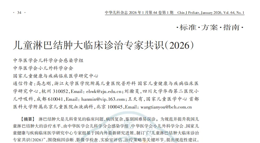 这篇由中华医学会儿科学分会感染学组、小儿外科学分会及国家儿童健康与疾病临床医学研究中心联合发布的《儿童淋巴结肿大临床诊疗专家共识(2026)》,旨在为儿科临床实践中这一常见但病因复杂的病症提供系统、规范的诊疗指导。
