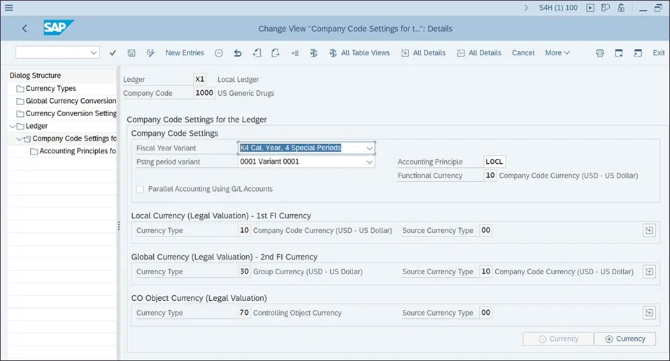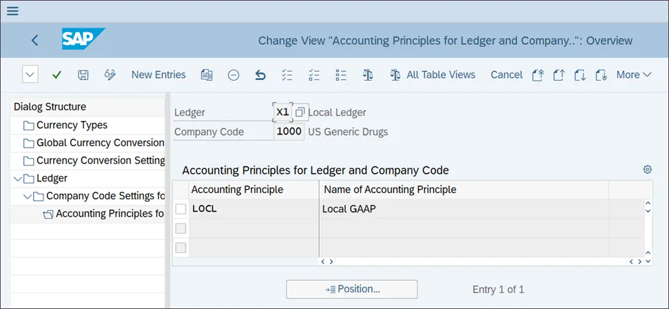 现在,您应该为每个分类账进行公司代码和货币设置。分别选择每个分类账,然后单击屏幕左侧的“分类账的公司代码设置”选项。然后,使用顶部菜单中的“新条目”命令,您可以添加所需的公司代码。