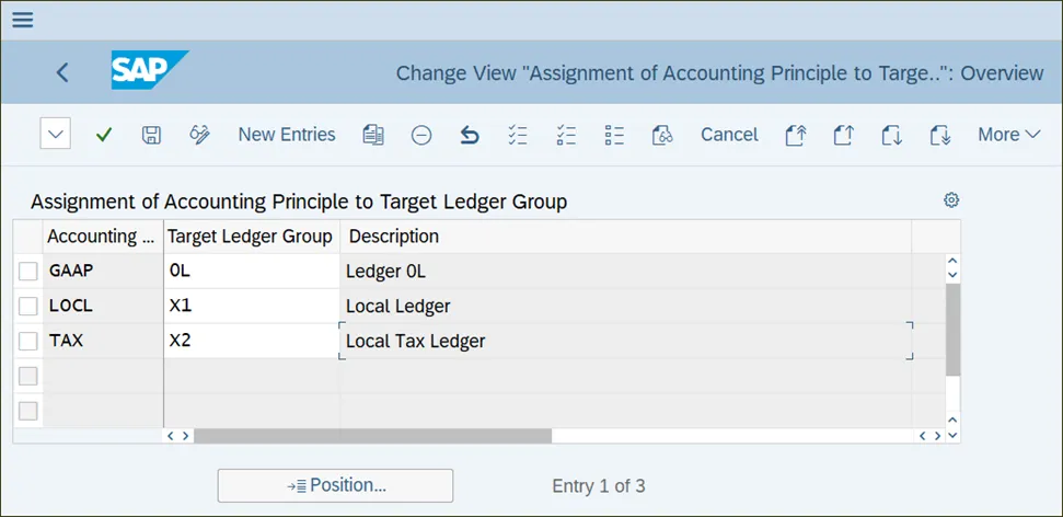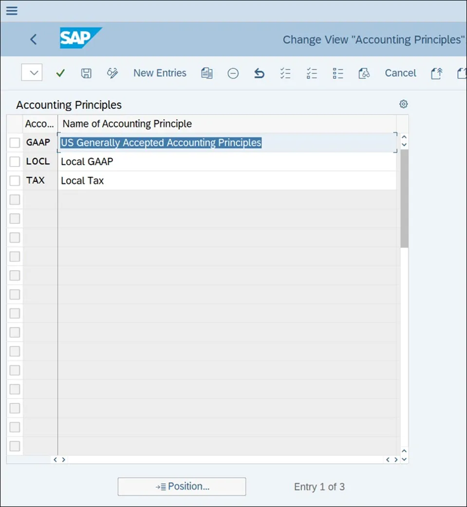 上图显示了以下重要设置:此设置指定用于此分类账的会计年度变式。不同的分类账可以有不同的会计年度变式,这是正常的;不同的估值原则可能需要不同的会计年度。例如,美国常用的 4 - 4 - 5 日历变式与全球最常用的日历年不对应。SAP 中的过账期间变式确定哪些期间对过账开放和关闭。此变式为各种类型的账户(总账、客户、供应商、资产等)提供了单独的开放和关闭期间的选项。在这里,在分类账级别,您可以指定一个变式。此复选框表示,对于此分类账,将使用平行总账账户而不是不同的分类账来体现平行会计原则。此选项很少使用,但通常是在一个分类账需要体现平行会计原则时使用。在此字段中,您将指定分类账当地货币的货币类型。当地货币是公司的主要货币,存储在每笔过账中,并在公司代码级别进行维护。但是,您也可以为每个分类账设置不同的当地货币。在此字段中,您将指定分类账全球货币的货币类型。全球货币是公司的集团货币,与每笔过账中的当地货币并行存储。在此字段中,您将指定分类账成本控制对象货币的货币类型。此货币用于成本控制对象主数据中,可能与交易货币不同。下一步是为分类账定义会计原则。会计原则是 SAP S/4HANA 中的一个新配置对象(“ACC_PRINCIPLE”字段)。此对象将分类账与它需要体现的相关会计框架进行映射。要查看分类账的会计原则,请单击同一配置屏幕左侧的“分类账和公司代码的会计原则”活动。如下图所示,代表当地会计准则的会计原则 LOCL 已映射到分类账 X1。要实际创建会计原则,请按照菜单路径“财务会计 • 财务会计全局设置 • 分类账 • 平行会计 • 定义会计原则”,如下图所示,您可以在此处定义会计原则。在我们的示例中,我们定义了三个会计原则来体现美国公认会计原则、当地公认会计原则和当地税收规则。下一步,您将这些会计原则分配给分类账组。一个分类账组通常包含一个分类账(系统会为您定义的每个分类账自动创建一个分类账组),但您可以在一个分类账组中包含多个分类账。会计原则的分配是在分类账组级别进行的。按照菜单路径“财务会计 • 财务会计全局设置 • 分类账 • 平行会计 • 将会计原则分配给分类账组”,如下图所示,您可以在此处将会计原则分配给分类账组。