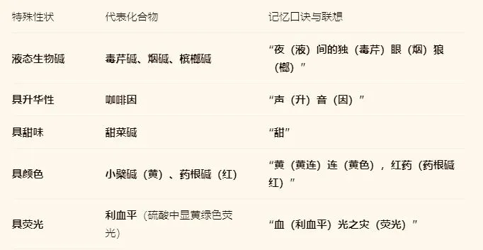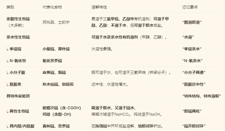 2.游离生物碱的溶解性对比速记表格