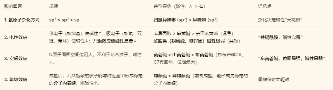 生物碱的碱性是一切化学行为和活性的基础,其强弱受四大因素影响。