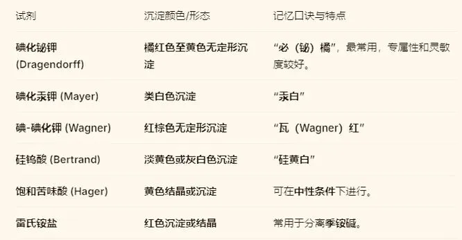 (3)⚠ 重要特例(不沉淀三兄弟):“麻(麻黄碱)吗(吗啡)咖(咖啡因)” —— 这三种生物碱不与一般沉淀试剂反应。