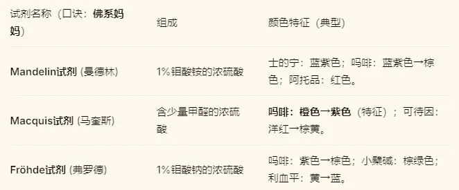 (1)常用显色剂口诀:“佛(Fröhde)系妈(Mandelin)妈(Marquis)”