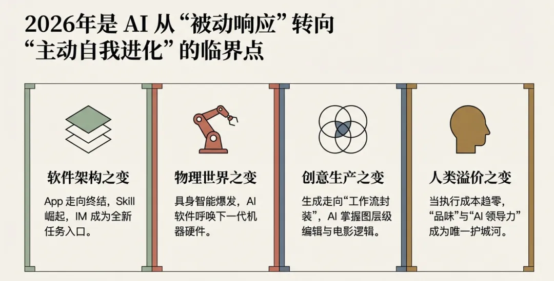 今天一口气读了几篇深度好文,从Clawdbot到蔡崇信访谈,从奥运大模型到Lovart的设计革命,信息量有点大。但把这些碎片拼在一起,我隐约看到了2026年AI赛道的几个确定性趋势。
