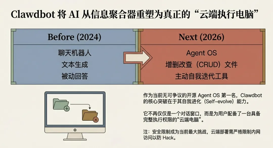 Clawdbot带来的增量是什么?本质是为你配了一台“云电脑”。过去AI是信息工具,现在它能真正去增、删、改、查文件,变成了执行工具。