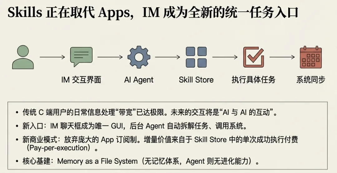 IM成了任务入口,GUI成了汇总看板,Skill取代了App。我们每个人都需要重新思考:在AI能批量“造牛马”的时代,我的独特价值在哪里?