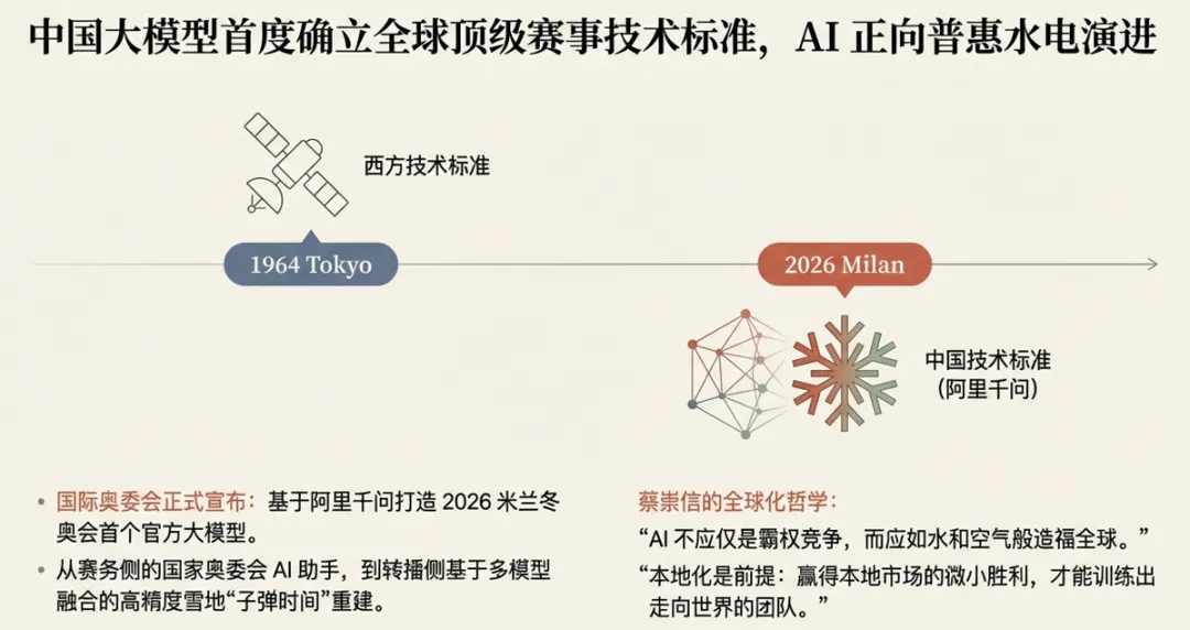 今天国际奥委会的新闻恰好印证了这一点:基于阿里千问大模型,打造了奥运史上首个“官方大模型”。从赛务侧的奥委会AI助手,到转播侧的雪地场景高精度重建,中国AI技术正在成为驱动全球顶级赛事的“核心大脑”。