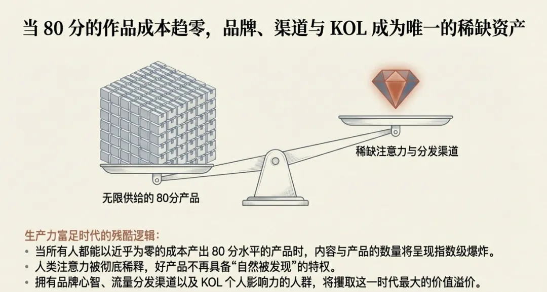 几乎所有人都能产出80分水平的产品,生产成本趋近于零。内容生产指数级爆炸,但我们的注意力也在指数级地分散。