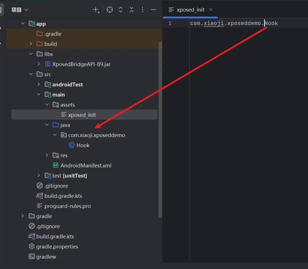 第三步,在 assets 目录新建 xposed_init 文件,定义入口点。