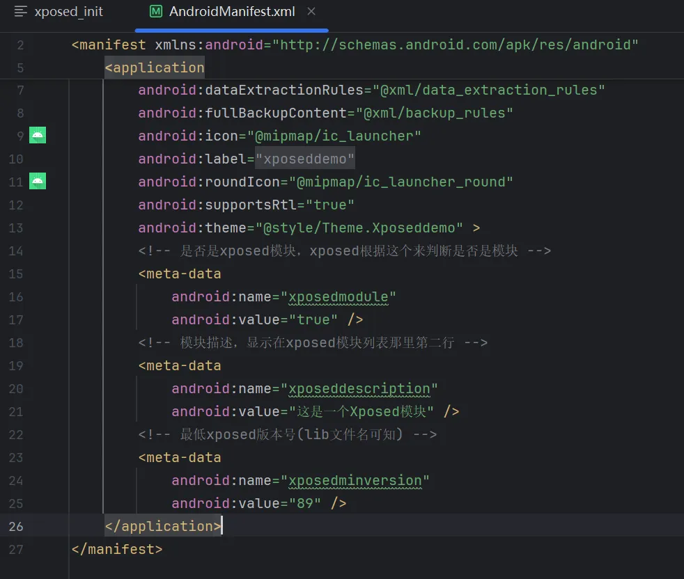 以Xposed框架为例,在开发 app 时候需要做以下几步以便于 LSPOSED 等 Xposed 框架识别和加载。