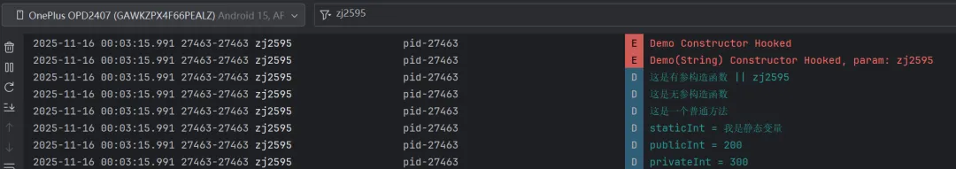 Log.e("zj2595","Demo(String) Constructor Hooked, param: " + param.args[0]);