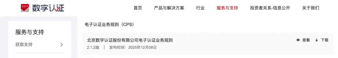 北京数字认证股份有限公司(数字认证BJCA)成立于2001年,国有控股上市企业(股票代码:300579),是国内领先的网络信任与数据安全解决方案提供商,也是拥有许可资质的电子认证服务提供商。以下为其官网公示的电子认证业务规则:https://www.bjca.cn/service/down_196.html 。