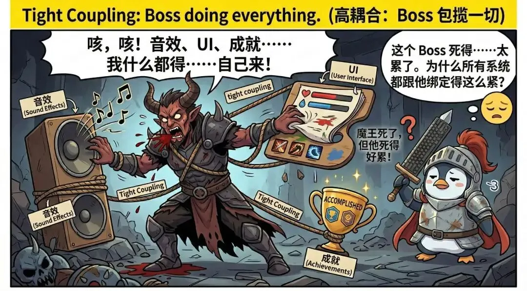 publicclassBoss{publicvoidDie() { Console.WriteLine("魔王倒下了!");// 🚫 高耦合写法 SoundManager.PlayVictory(); UIManager.ShowWinScreen(); AchievementManager.Unlock("DragonSlayer"); }}