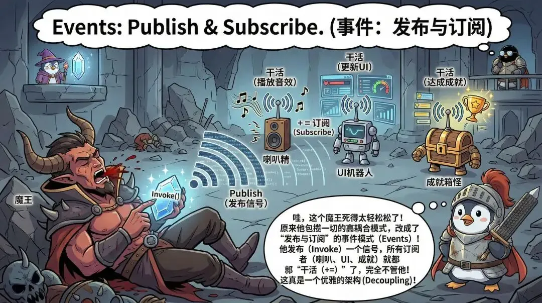 Boss myBoss = new Boss();// 音效系统订阅myBoss.OnDeath += SoundManager.PlayVictory;// UI 系统订阅myBoss.OnDeath += UIManager.ShowWinScreen;// 魔王死亡myBoss.Die();