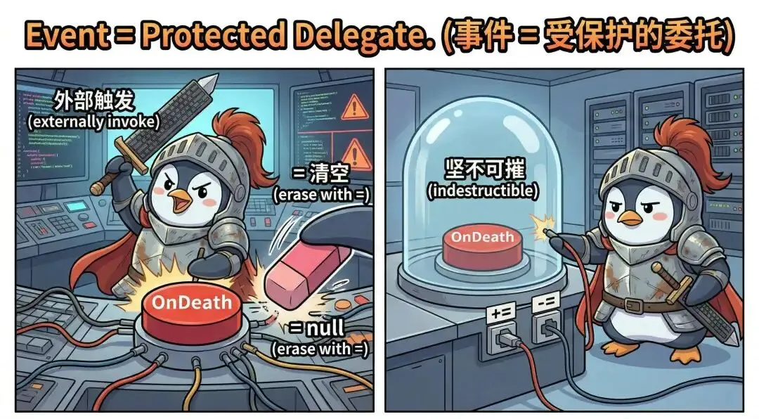 // 手滑用 = 清空所有订阅myBoss.OnDeath = PipiManager.LootGold;// 外部直接触发myBoss.OnDeath();