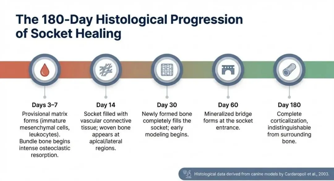 - 30 - 60天: 新骨充满牙槽窝,形成矿化骨桥。