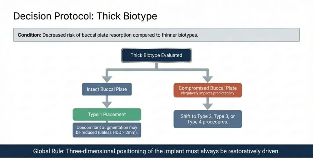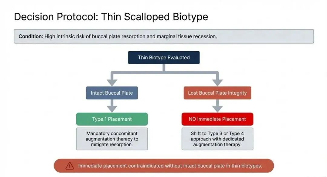 - 厚生物型: 风险较低,但若唇侧骨板不完整,需要同期骨增量治疗。